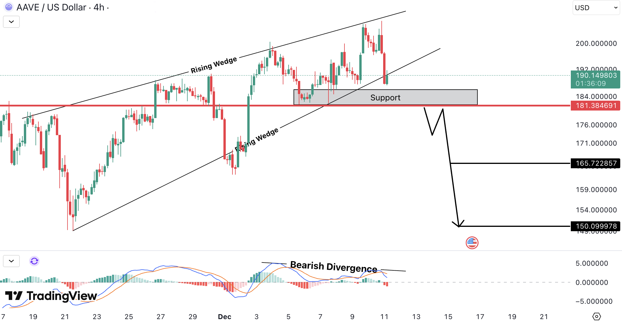 AAVEUSD a format un rising wedge impreuna cu bearish divergence, ambele sugerand probabilitate crescuta de miscare descendenta.