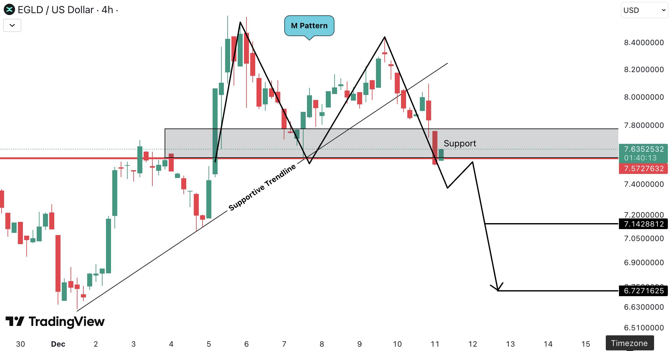EGLDUSD a rupt trendline-ul de suport si a format un M pattern, un model bearish care indica probabilitate crescuta de continuare in jos. Pentru confirmare, avem nevoie de breakdown si inchidere de candle sub zona de suport de 7.57 USD.