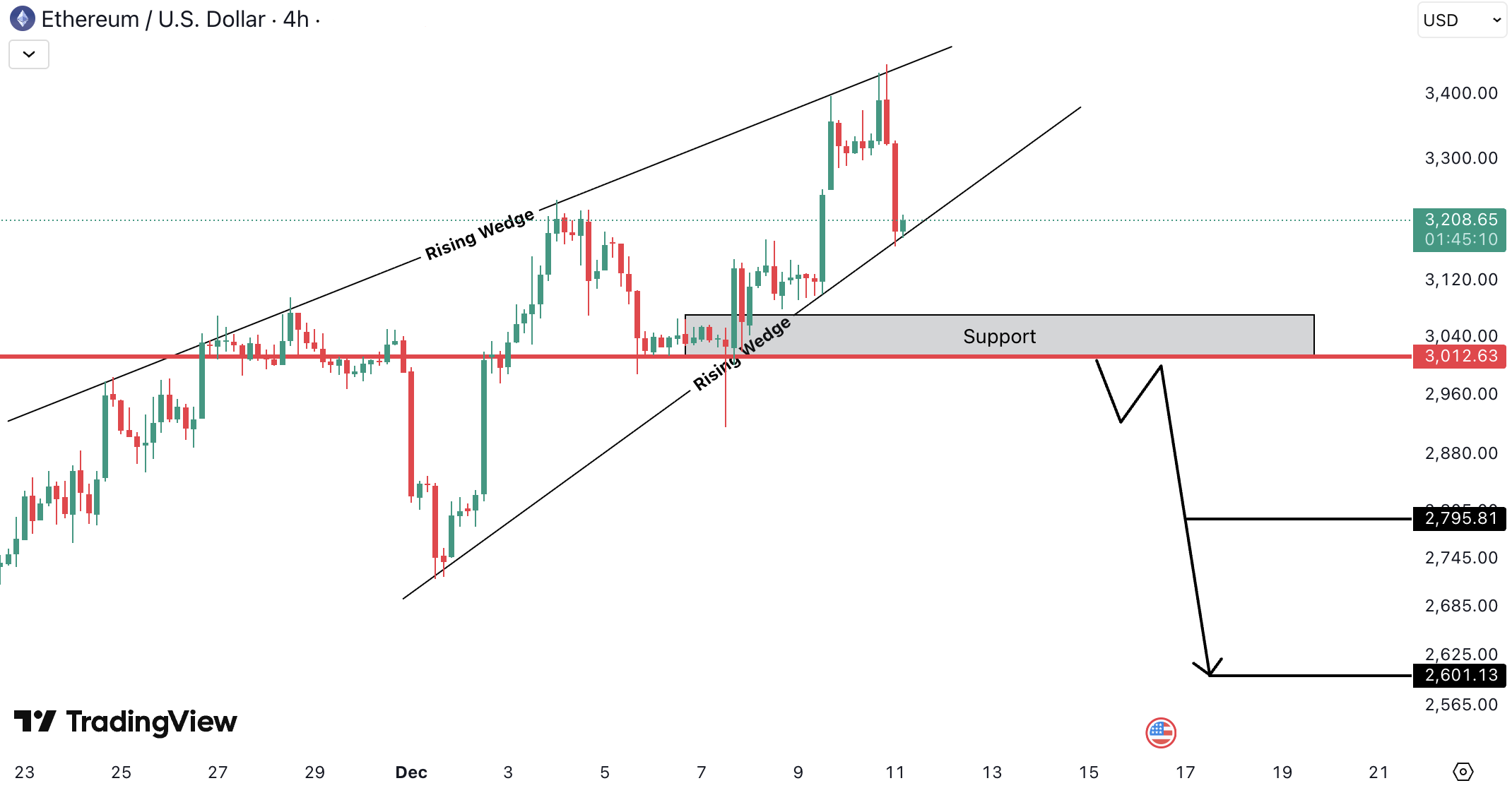 ETHUSD a format un rising wedge, un model bearish care creste probabilitatea unui declin. Confirmarea vine doar dupa breakdown si inchidere de candle sub zona de suport 3,012 USD. Daca acest nivel cedeaza, pretul poate avansa spre tintele 2,795 USD si 2,601 USD.