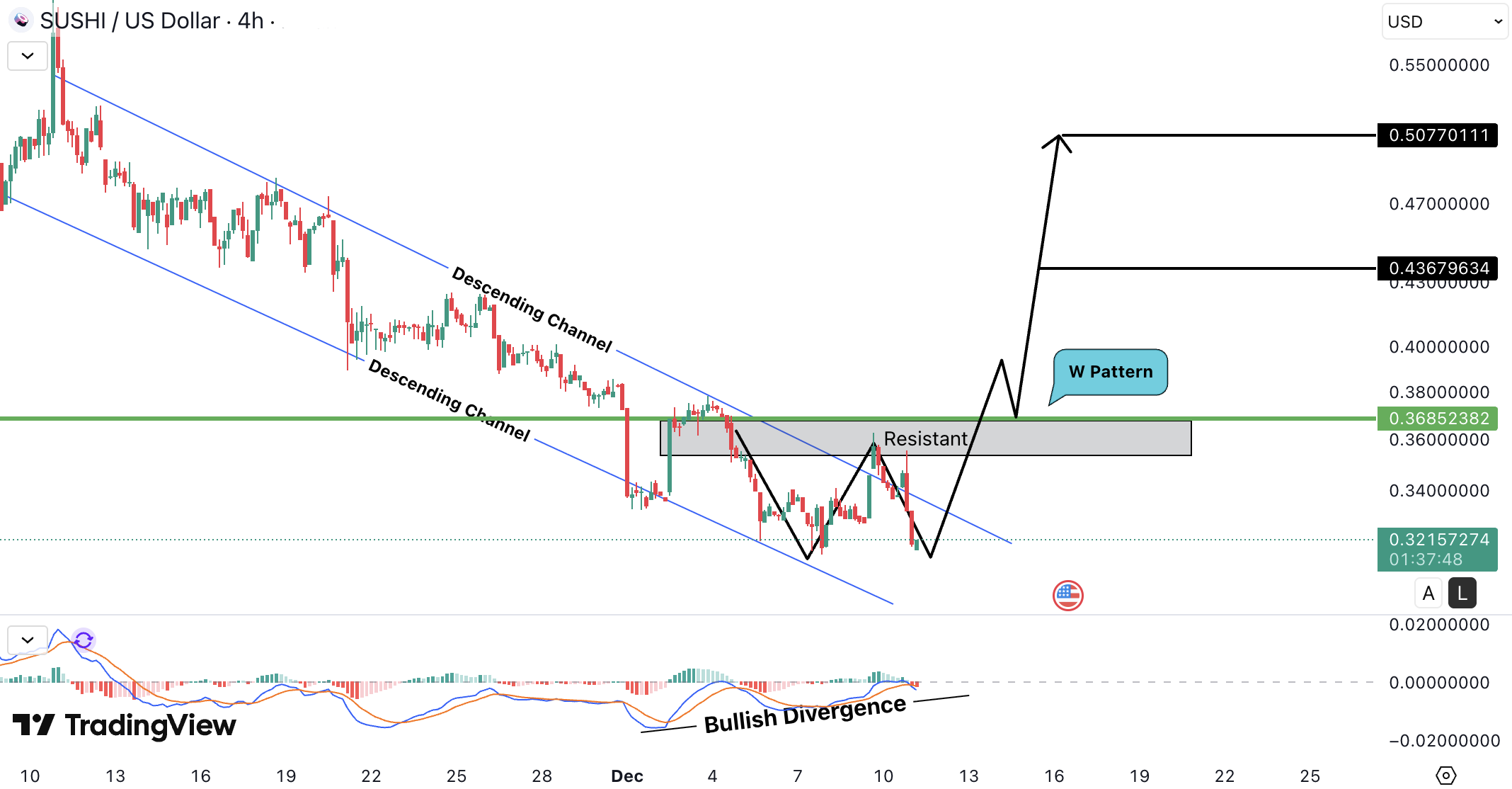 SUSHIUSD a format un descending channel insotit de bullish divergence, ceea ce favorizeaza un posibil trend ascendent, dar doar dupa confirmare.