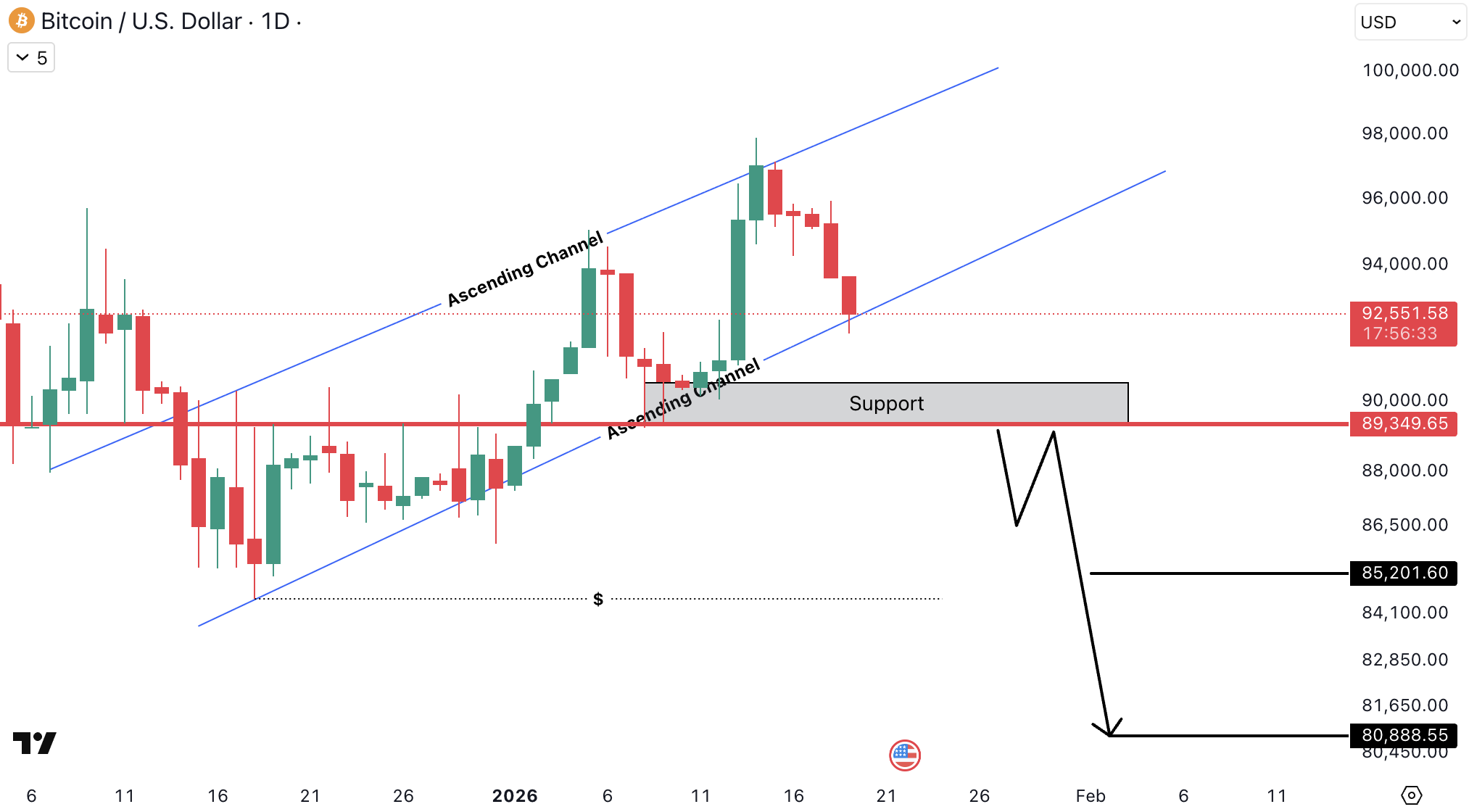 BTCUSD pe timeframe daily se tranzactioneaza in continuare in interiorul unui ascending channel, ceea ce indica faptul ca structura bullish de ansamblu ramane valida pentru moment. Pretul reactioneaza acum in zona mediana spre inferioara a canalului si se apropie de suportul orizontal cheie din jurul nivelului de 89,350.00 USD (≈82,202 EUR), care functioneaza ca zona de decizie.