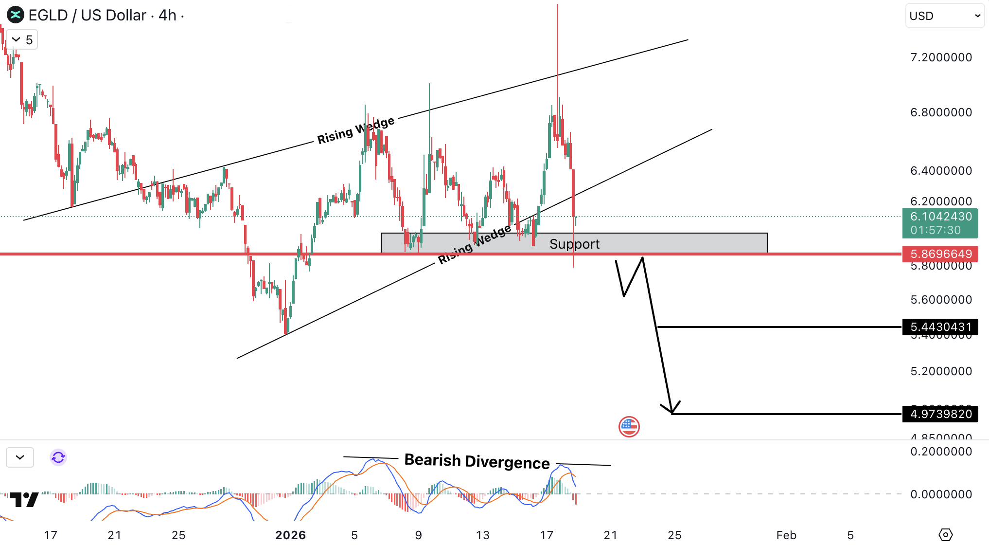 EGLDUSD pe timeframe 4H se tranzactioneaza intr-un rising wedge si a aratat un rejection puternic din partea superioara a structurii, sustinut de o bearish divergence clara, ceea ce creste probabilitatea unui move de scadere. Pretul reactioneaza in prezent in jurul zonei de suport cheie de 5.87 USD (≈5.40 EUR).