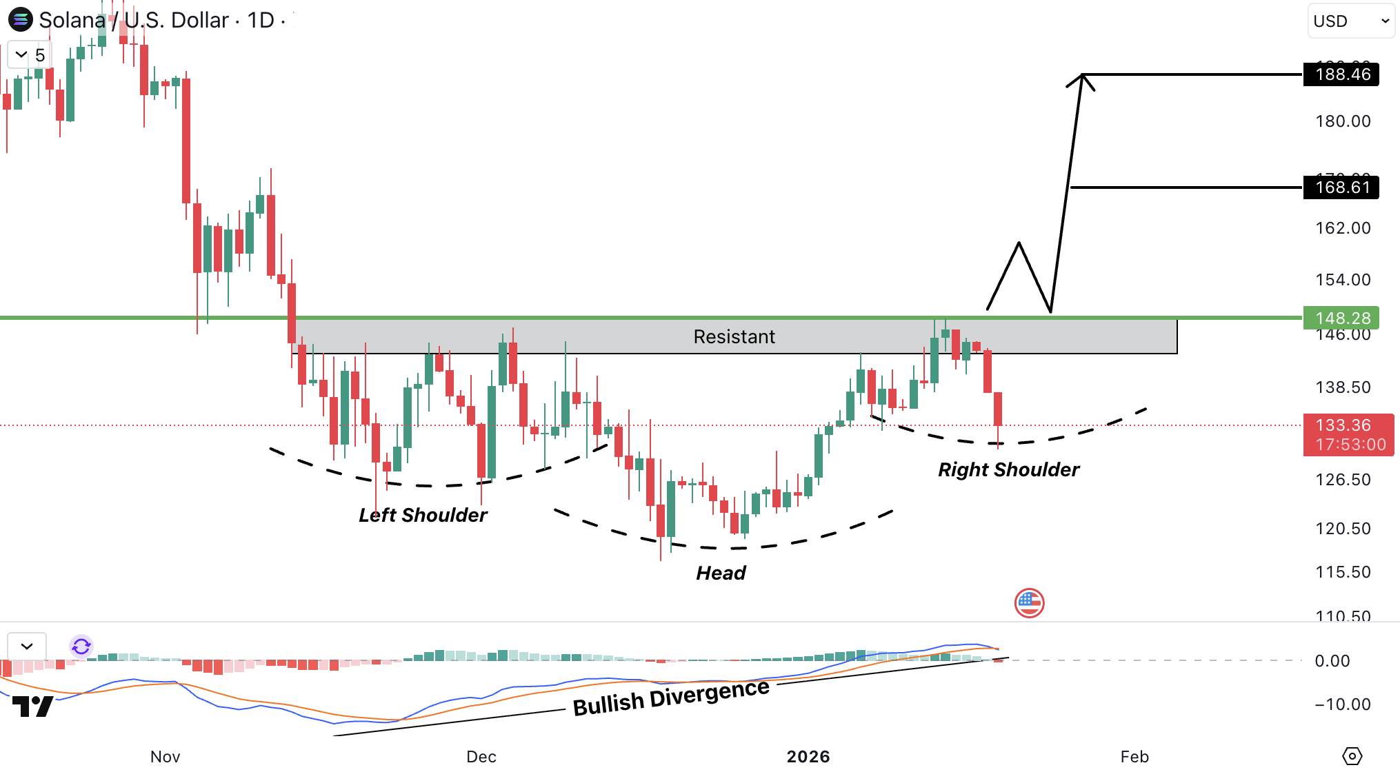SOL/USD pe timeframe daily formeaza o structura de inverse head and shoulders, cu left shoulder si head deja formate, iar right shoulder fiind in curs de dezvoltare. Pretul se tranzactioneaza sub zona de rezistenta cheie din jurul 148.00 USD (≈136 EUR), care functioneaza ca neckline.