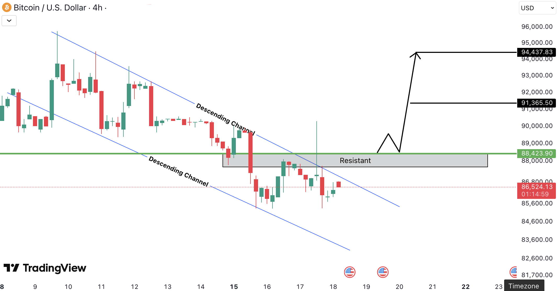 BTCUSD a format un descending channel. In cazul in care pretul iese din aceasta structura si avem o lumanare care inchide peste zona de rezistenta de 88,423.00 USD (aprox. 81,349.16 EUR), miscarea ar confirma un breakout bullish.
