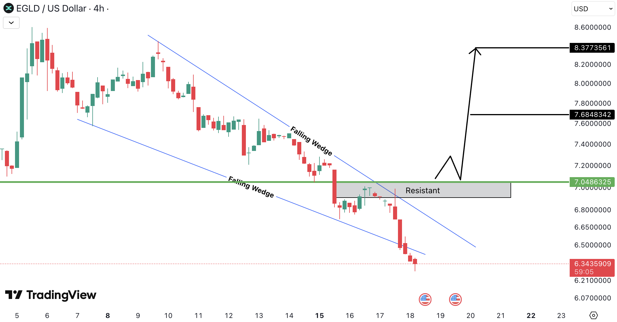 EGLDUSD a format un falling wedge, un pattern bullish clasic. Pentru confirmare este necesar un breakout urmat de o lumanare care inchide peste zona de rezistenta de 7.04 USD (aprox. 6.48 EUR).