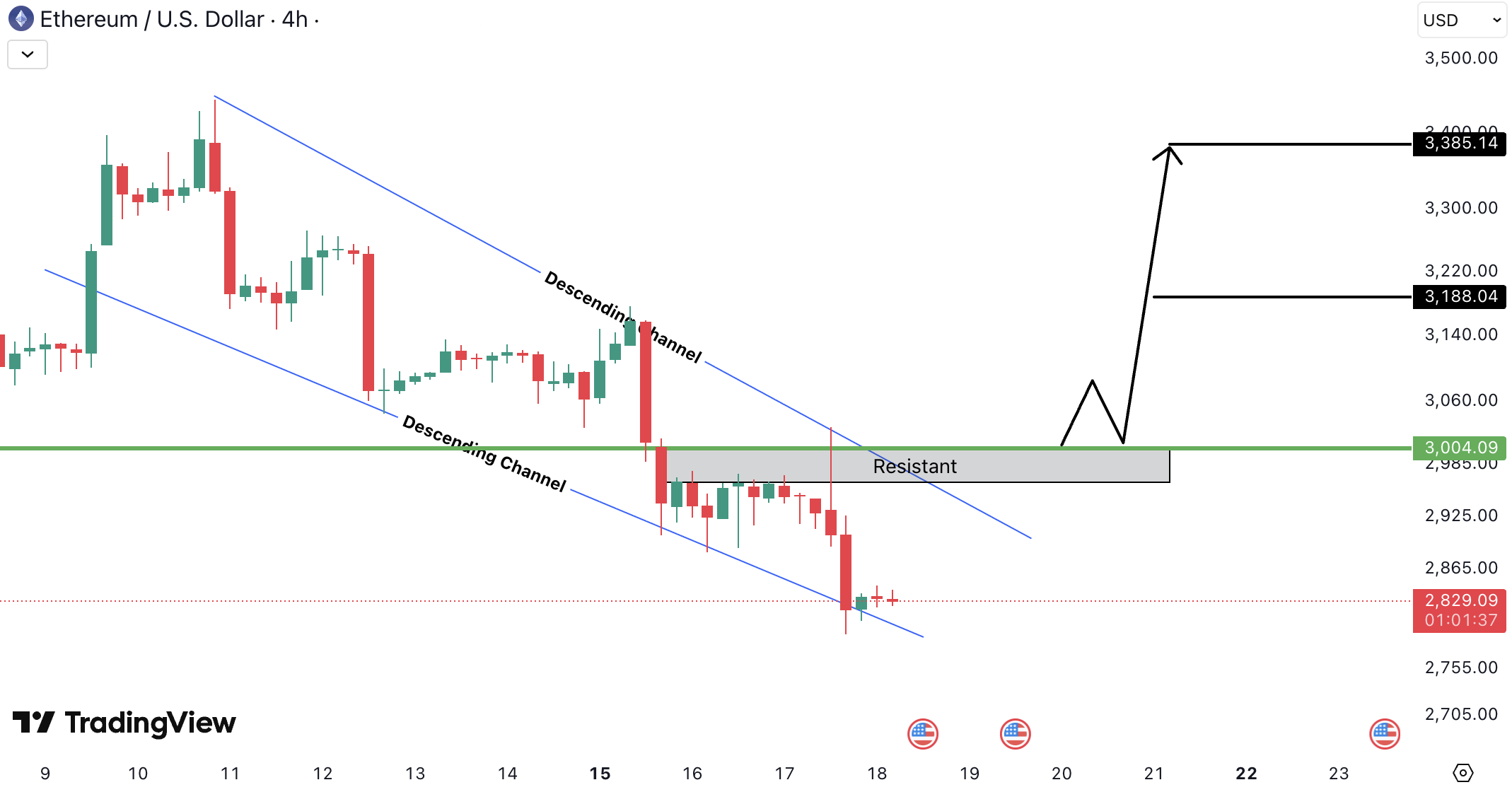 ETHUSD urmeaza o structura similara cu BTC si a format, de asemenea, un descending channel, considerat un pattern bullish. Totusi, pentru confirmare clara, este necesar un breakout si o lumanare care sa inchida peste rezistenta de 3,004.00 USD (aprox. 2,763.68 EUR).