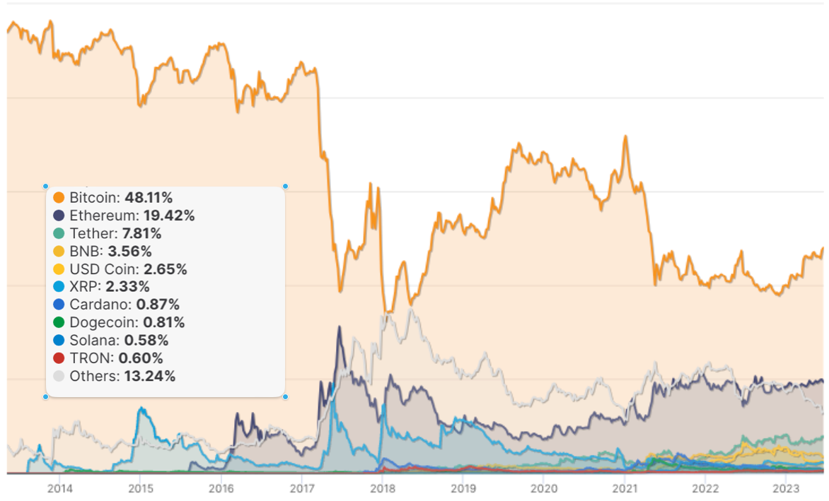 In trecut, Bitcoin domina piata cu o valoare de peste 85%, dar in ultimii ani a scazut in favoarea altcoinurilor, cum ar fi Ethereum si altele, dezvoltate pe reteaua Ethereum sau pe propria lor retea.