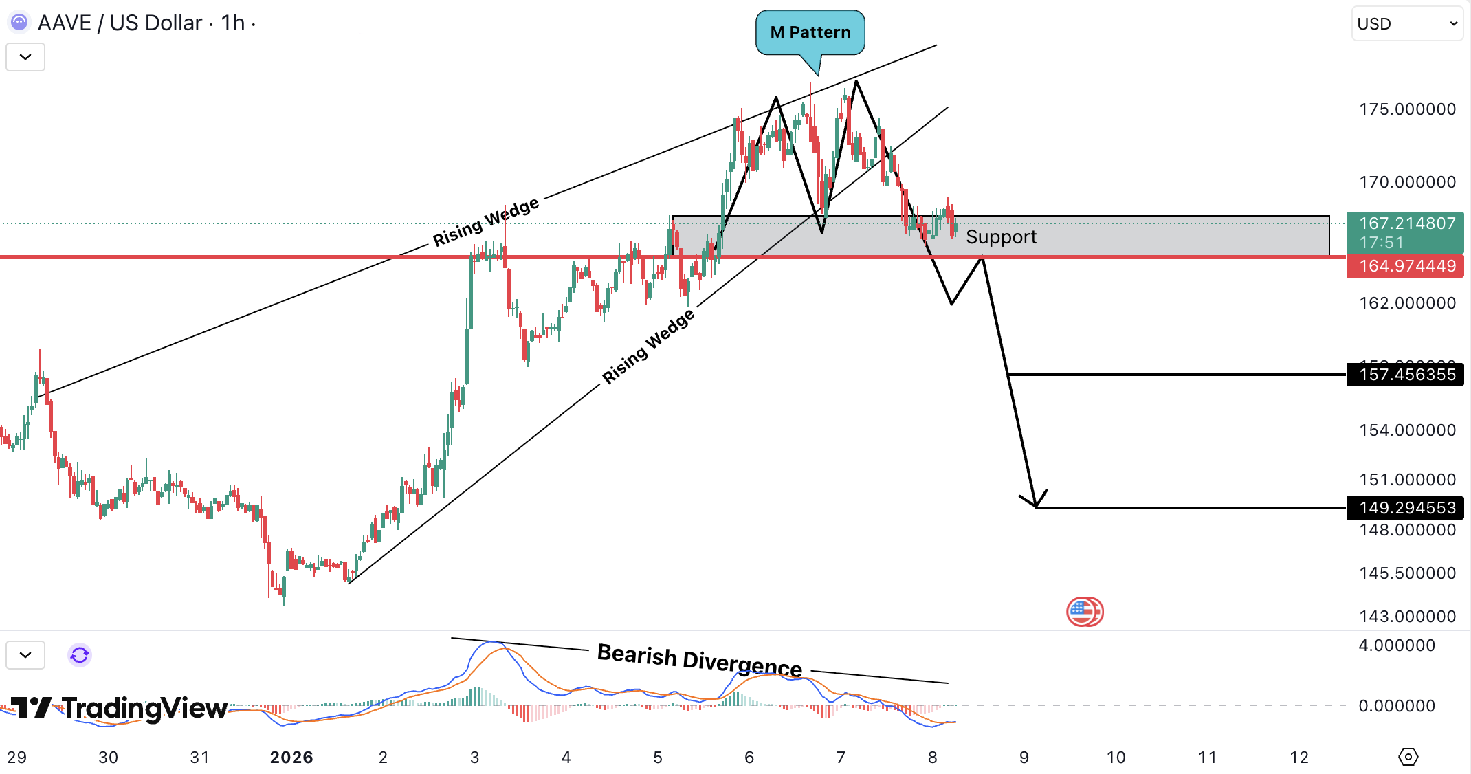 AAVEUSD on the 1H timeframe has formed an M pattern following a rising wedge breakdown, signaling a potential bearish reversal. Price is currently hovering around the support zone at: