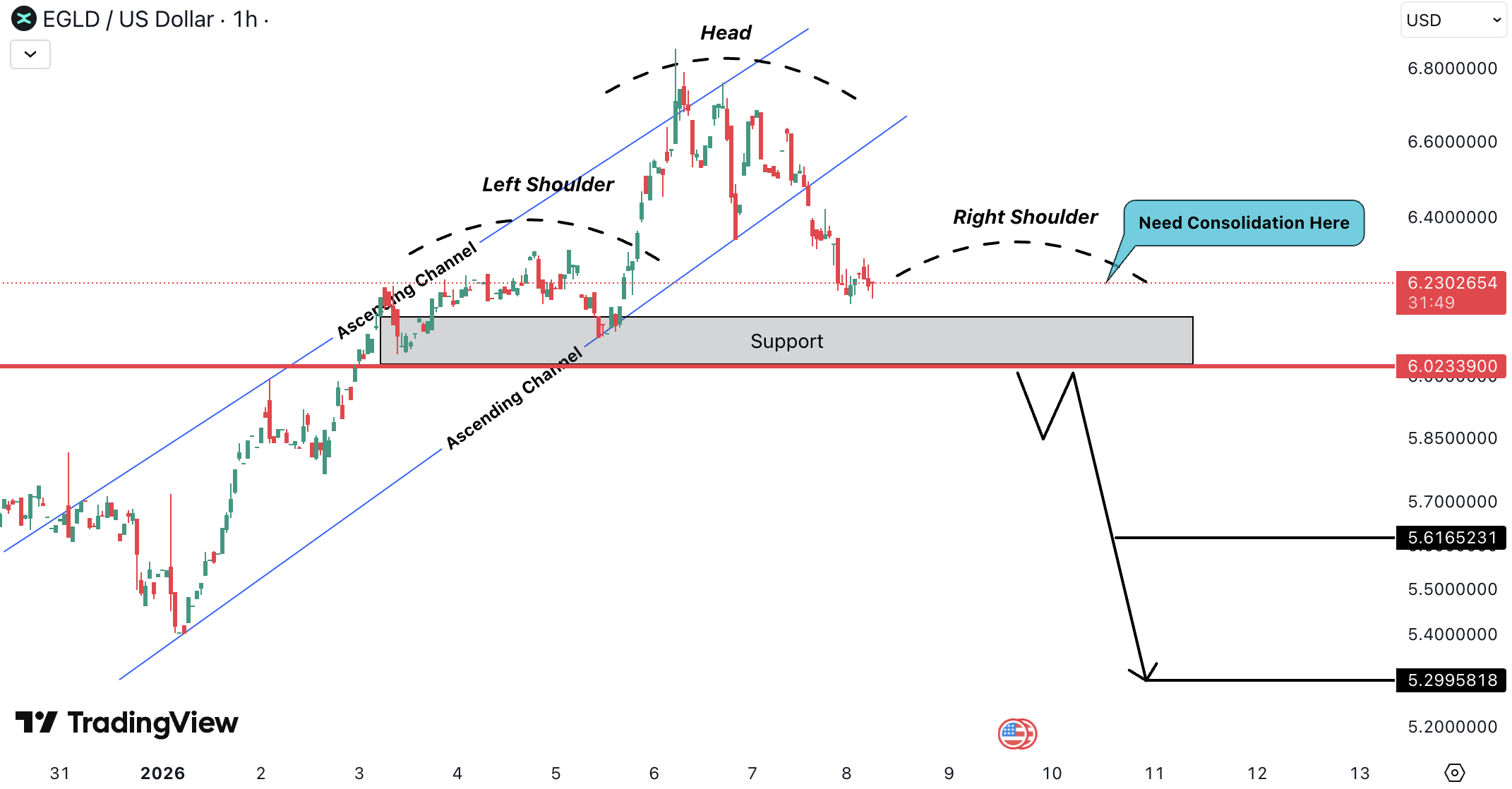 EGLDUSD on the 1H timeframe has broken down from the ascending channel, signaling weakening bullish momentum. The chart is forming a head and shoulders pattern, with the right shoulder still under construction near the support zone.