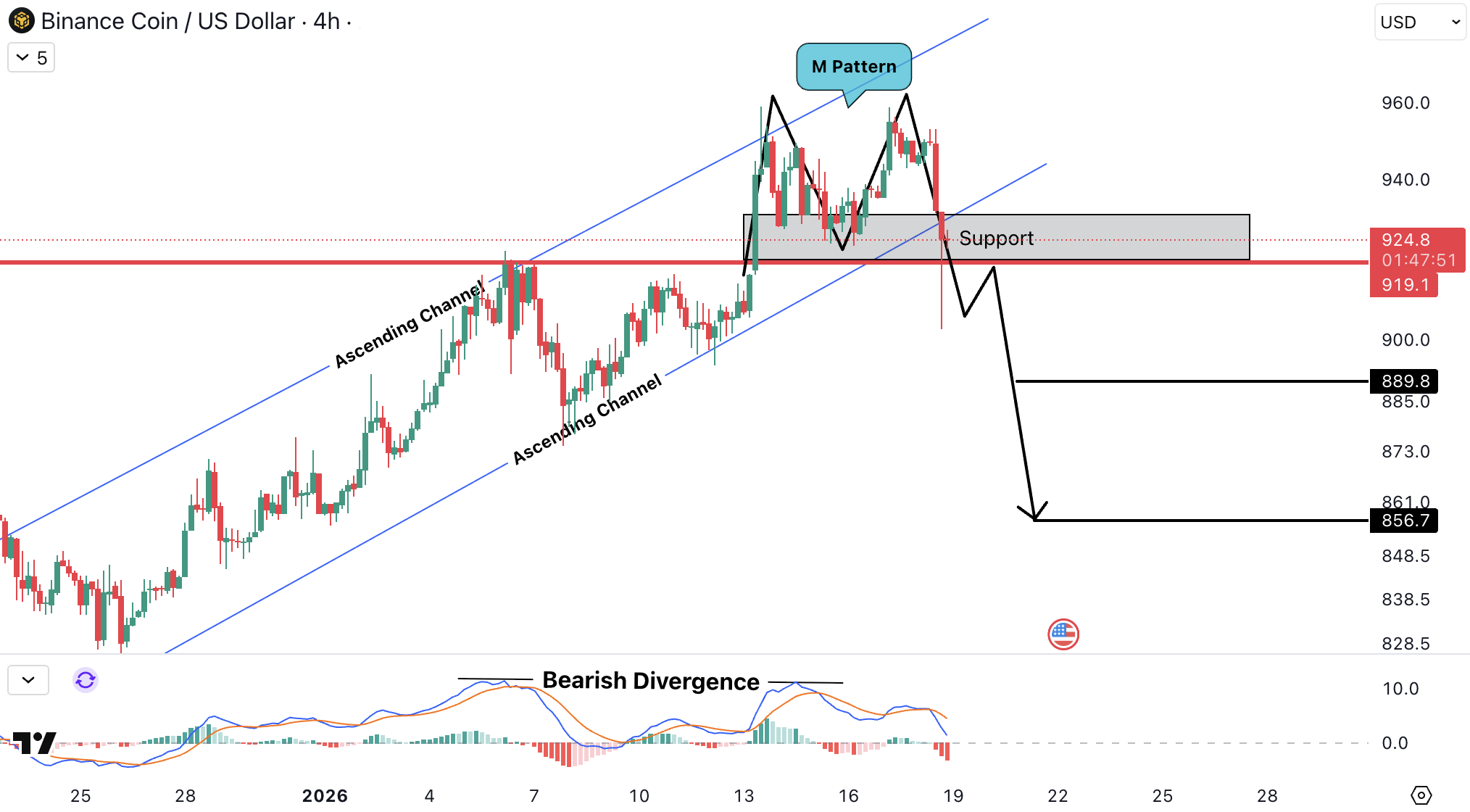 BNB/USDT on the 4H timeframe remains inside an ascending channel, but momentum has clearly weakened. Price has formed an M pattern near the channel high, supported by visible bearish divergence.