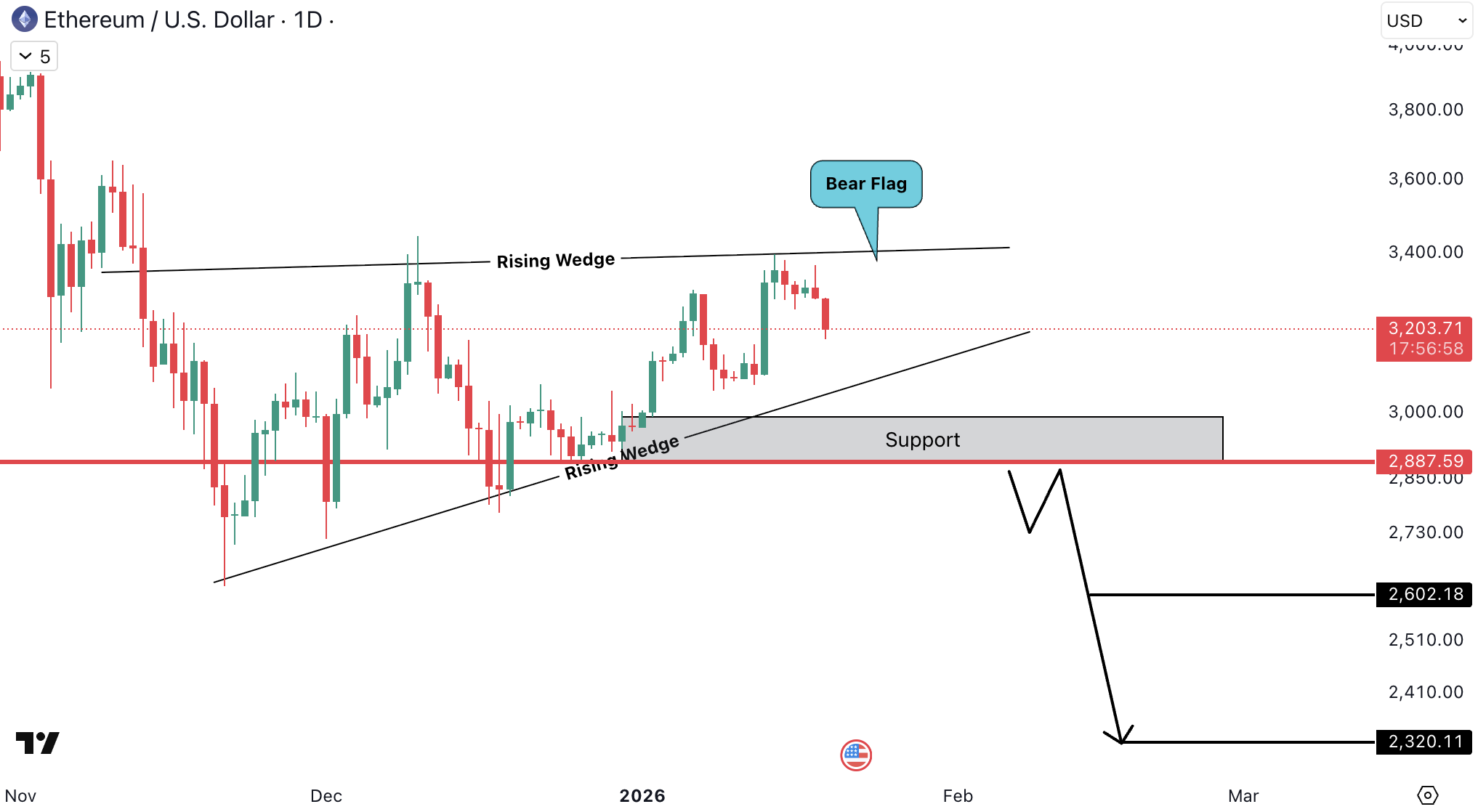 ETHUSD on the daily timeframe is trading inside a rising wedge and has recently formed a bear flag, increasing the probability of bearish continuation. Momentum is weakening near the upper wedge resistance, while the key support zone sits around 2,887.00 USD (≈2,656 EUR).