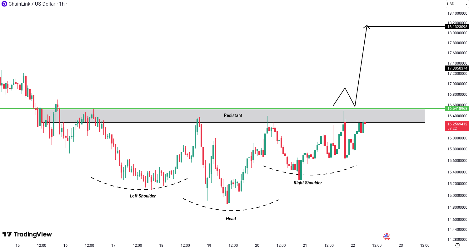 LINK is showing strength as it forms an inverse head and shoulders pattern, which is a classic bullish reversal setup. This indicates that selling pressure is fading and buyers are gradually gaining control. The probability of a bullish move increases significantly if the price breaks out and closes a candle above the resistance zone at 16.54 USD. If this happens, we can expect a continuation toward the targets of 17.30 USD and 18.13 USD.