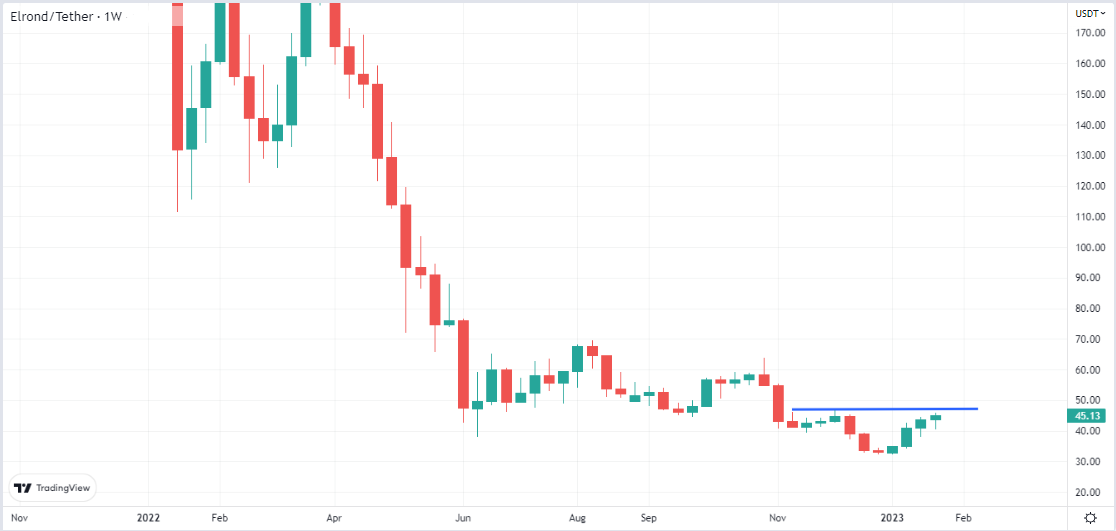 Tokenul retelei romanesti MultiversX, se apropie de o zona de rezistenta de importanta medie – nivelul de 48 USD – nivel de pret de unde EGLD a fost respins in jos in luna Noiembrie 2022.