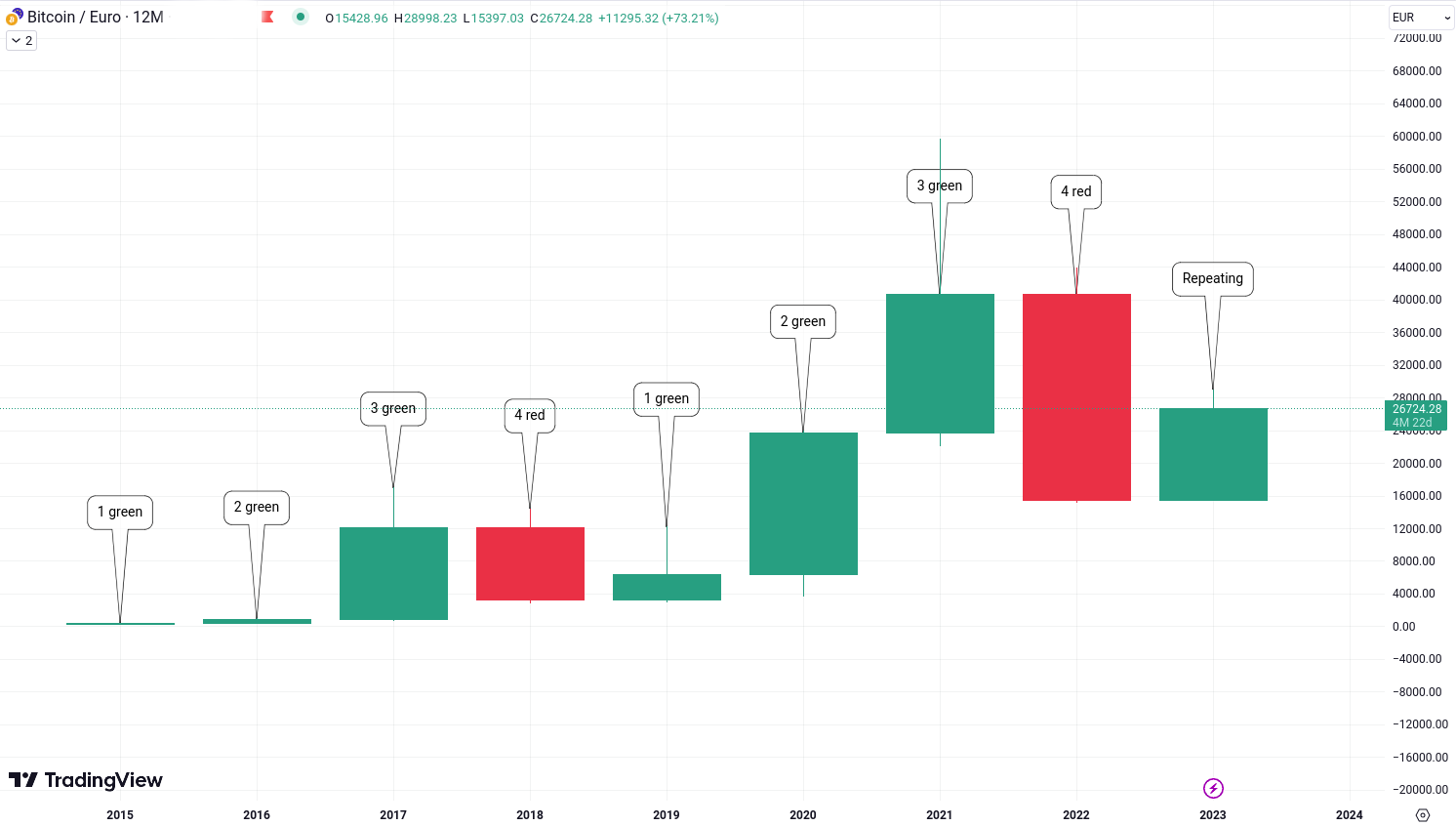 Examinand graficul candlestick-urilor pe 12 luni pentru BTC/EUR, putem observa un model constant. Trei candlestick-uri pozitive urmate de un singur candlestick negativ, iar aceasta repetitie s-a produs de doua ori in aceasta perioada. Este important de mentionat faptul ca Bitcoin se afla in prezent in procesul de generare a unui alt candlestick pozitiv. Acest model sugereaza o posibila tendinta pozitiva pe termen lung.