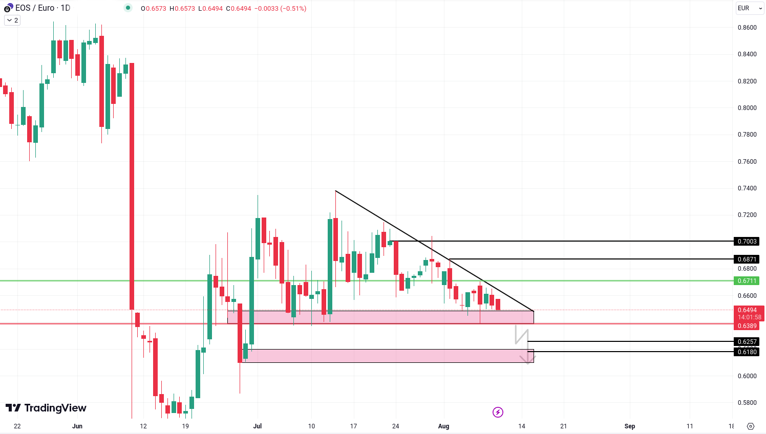 Actiunea recenta a pretului EOS/EUR a condus la formarea unui model de triunghi, caracterizat de linii de trend convergente. In prezent, pretul se consolideaza in apropierea unei zone de suport cruciale.