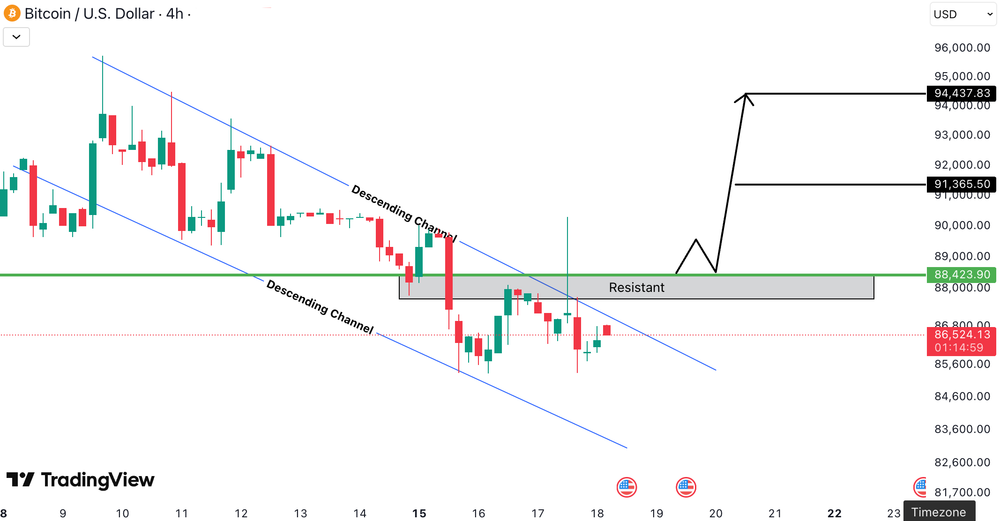 BTCUSD has formed a descending channel. If the price breaks out of this structure and we get a candle closing above the resistance zone at 88,423.00 USD (approx. 81,349.16 EUR), this would confirm a bullish breakout.