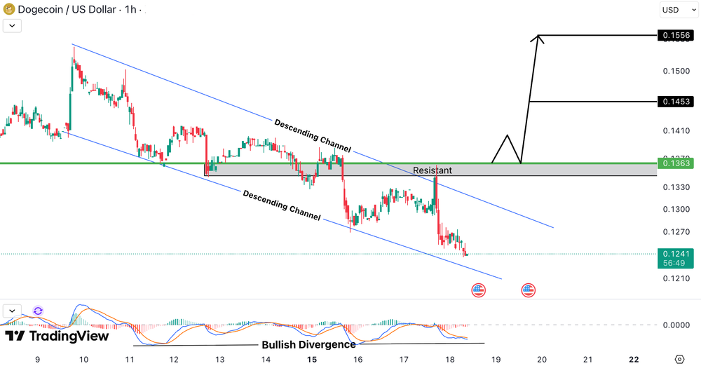 DOGEUSD has formed a descending channel, accompanied by bullish divergence, a combination that increases the probability of a bullish move. For confirmation, we need a breakout and a candle closing above the resistance zone at 0.1363 USD (approx. 0.1254 EUR).