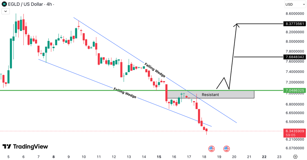 EGLDUSD has formed a falling wedge, a classic bullish pattern. For confirmation, we need a breakout followed by a candle closing above the resistance zone at 7.04 USD (approx. 6.48 EUR).