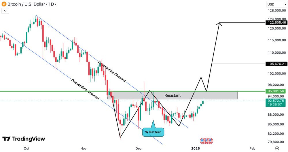BTCUSD on the daily timeframe has broken out of the descending channel, which is a bullish structure in a higher-timeframe context. A clear W pattern has formed near the lower boundary, signaling weakening bearish pressure and potential trend reversal.