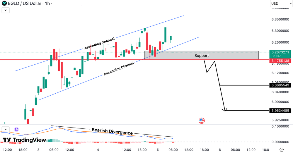 EGLDUSD on the 1H timeframe is moving inside an ascending channel after a bullish impulse. However, a clear bearish divergence is now present, increasing the probability of a corrective move.