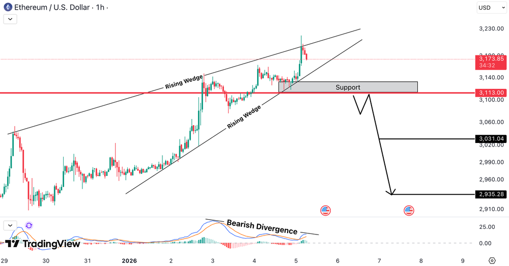 ETHUSD on the 1H timeframe has formed a rising wedge, which is a bearish structure. At the same time, a clear bearish divergence is present, increasing the probability of a downside move.