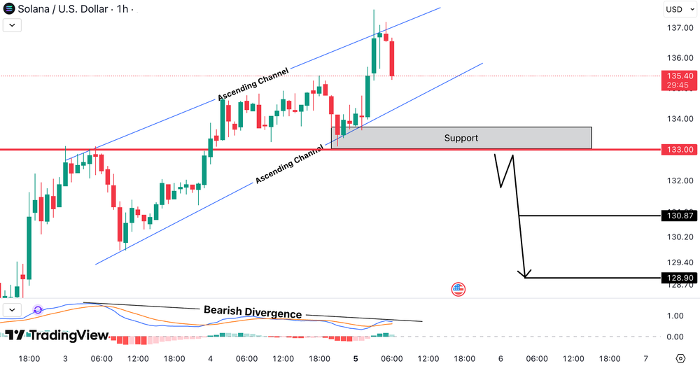 SOLUSD on the 1H timeframe is trading inside an ascending channel after a strong bullish move. However, the presence of clear bearish divergence increases the probability of a pullback.