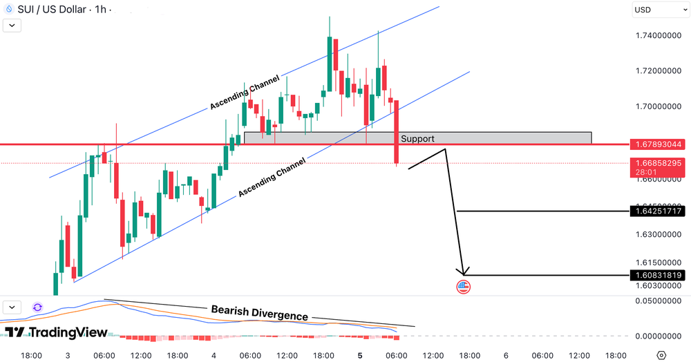 SUI is currently attempting to break below the support zone, strengthening the bearish scenario. The presence of bearish divergence combined with rejection from the upper side of the ascending channel increases the probability of a downside move.