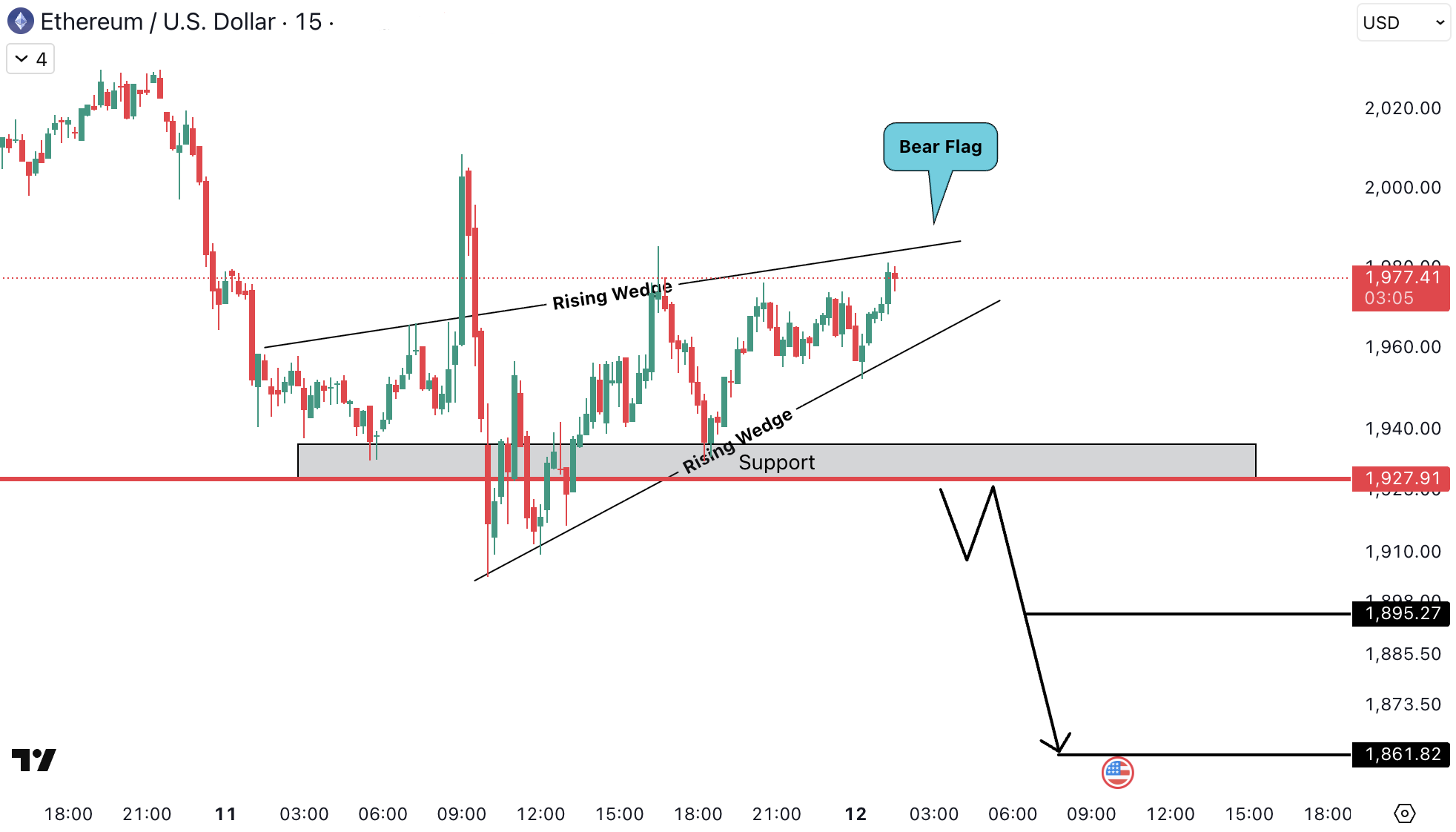 ETHUSD on the 15-minute timeframe is moving upward inside a rising wedge while forming a bear flag after a sharp drop, which usually represents a temporary relief bounce rather than a real trend reversal. The market is holding just above support near 1,928 USD (1,630 EUR), but momentum is fading as candles keep rejecting near the upper trendline around 1,975–1,980 USD (1,670–1,675 EUR). This structure often breaks to the downside. A confirmed close below support could trigger a quick move toward 1,895 USD (1,606 EUR), and if selling expands the next liquidity zone is near 1,860 USD (1,577 EUR). Until support breaks, ETH may consolidate inside the wedge, but overall structure still favors bearish continuation.