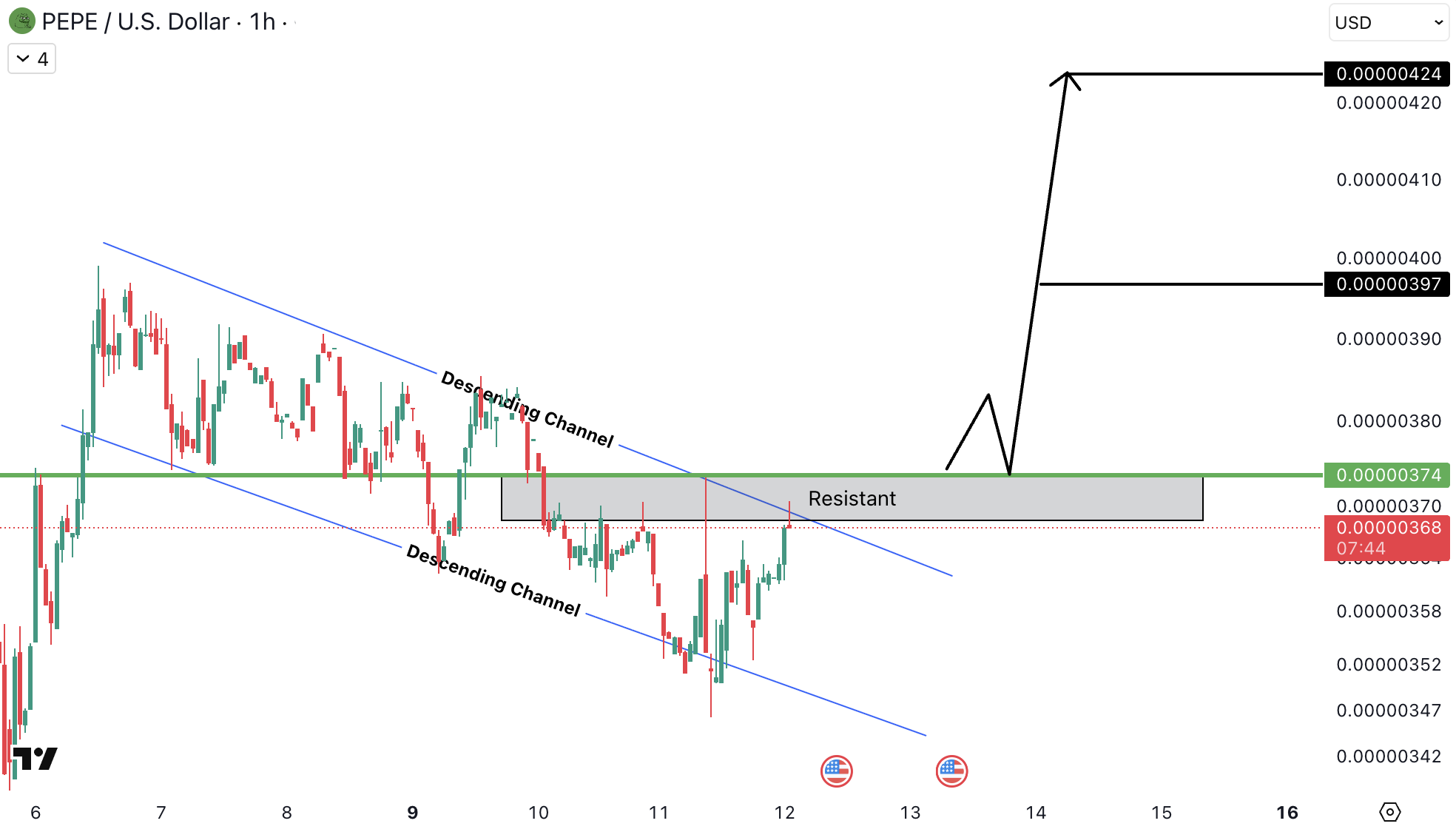 PEPEUSD is attempting a breakout after moving inside a descending channel, with price approaching resistance near 0.0000037–0.00000374 USD (0.00000313–0.00000316 EUR). This area is the key barrier for bullish continuation. A clean reclaim and hold above resistance could trigger upside toward 0.00000397 USD (0.00000336 EUR) and then 0.00000424 USD (0.00000359 EUR). Rejection from this zone may send price back toward the channel range before any stronger move.