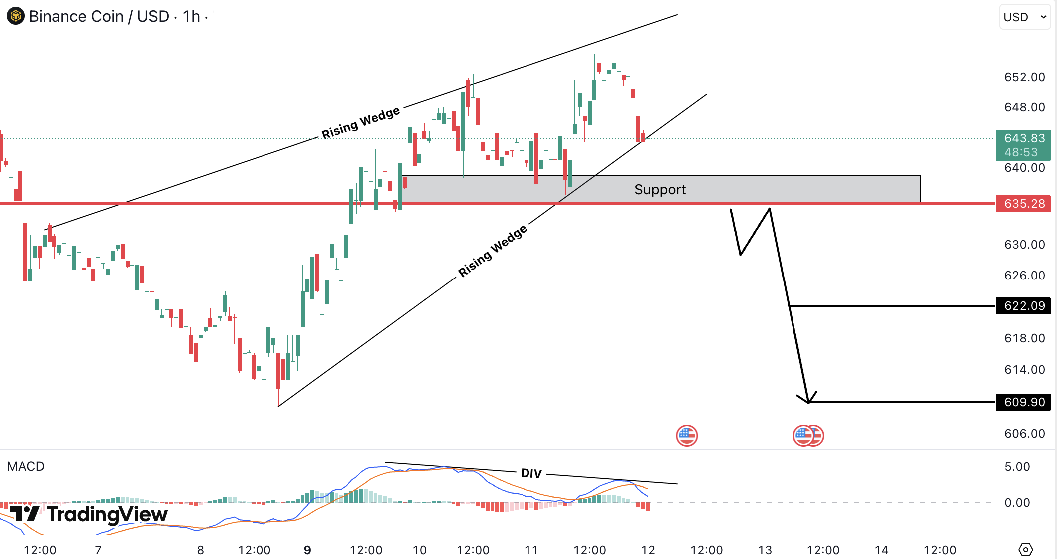 On the 1H timeframe, BNBUSD is trading inside a rising wedge with bearish divergence on MACD, while testing the 635.00 USD (584 EUR) support zone.