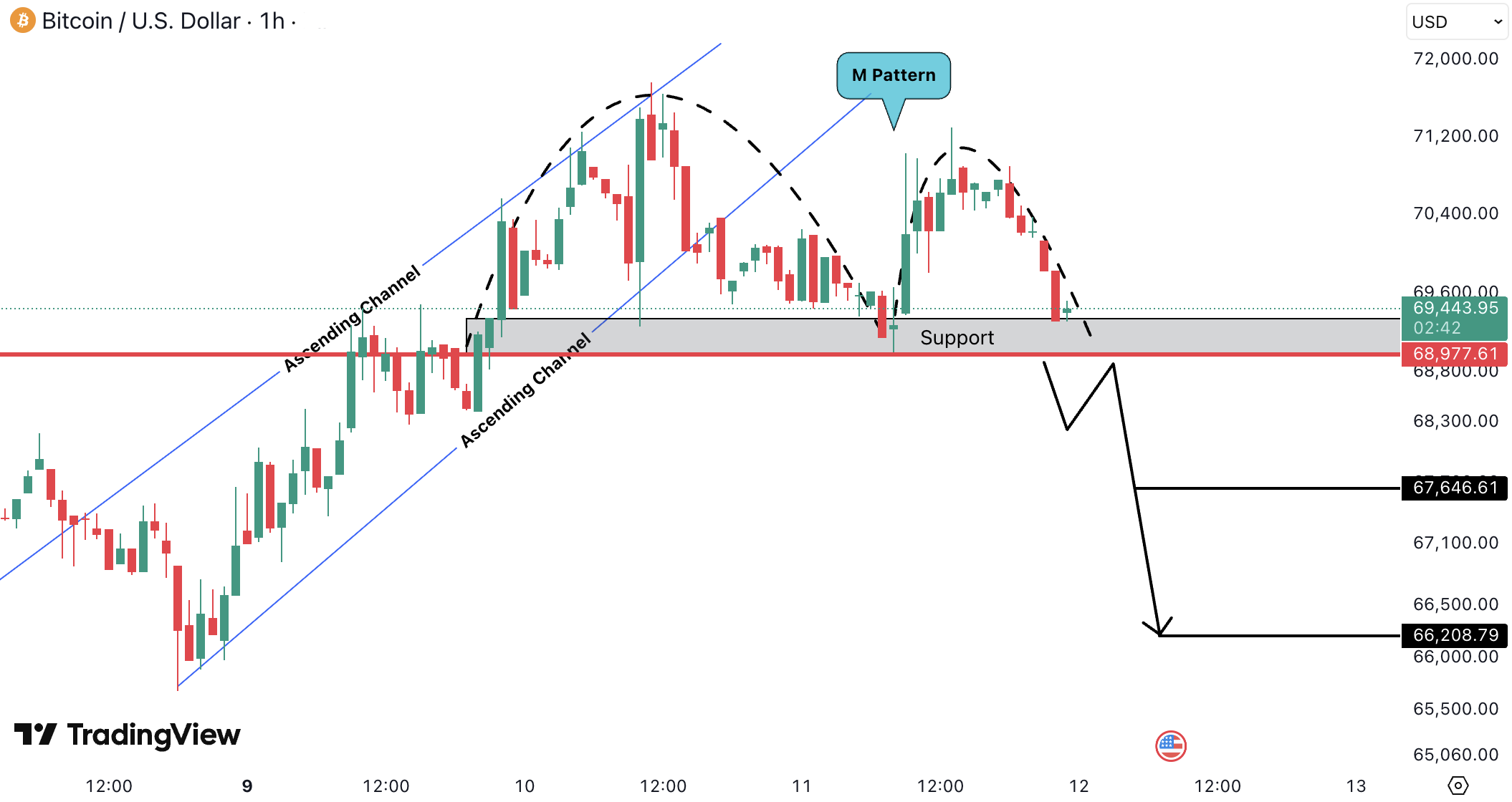 On the 1H timeframe, BTCUSD is forming an M pattern after breaking down from an ascending channel and is currently testing the 68,900.00 USD – 69,400.00 USD support zone (approx. 63,388 EUR – 63,849 EUR).
