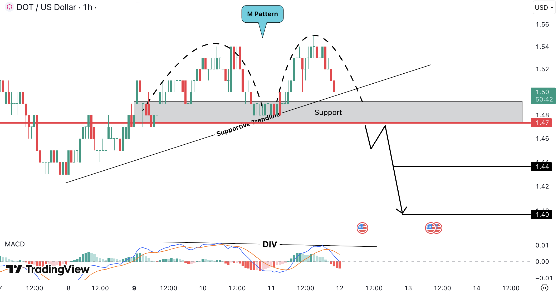 On the 1H timeframe, DOTUSD is forming an M pattern with bearish divergence on MACD while testing the 1.47 USD – 1.49 USD support zone (1.35 EUR – 1.37 EUR). This level also aligns with a supportive trendline.