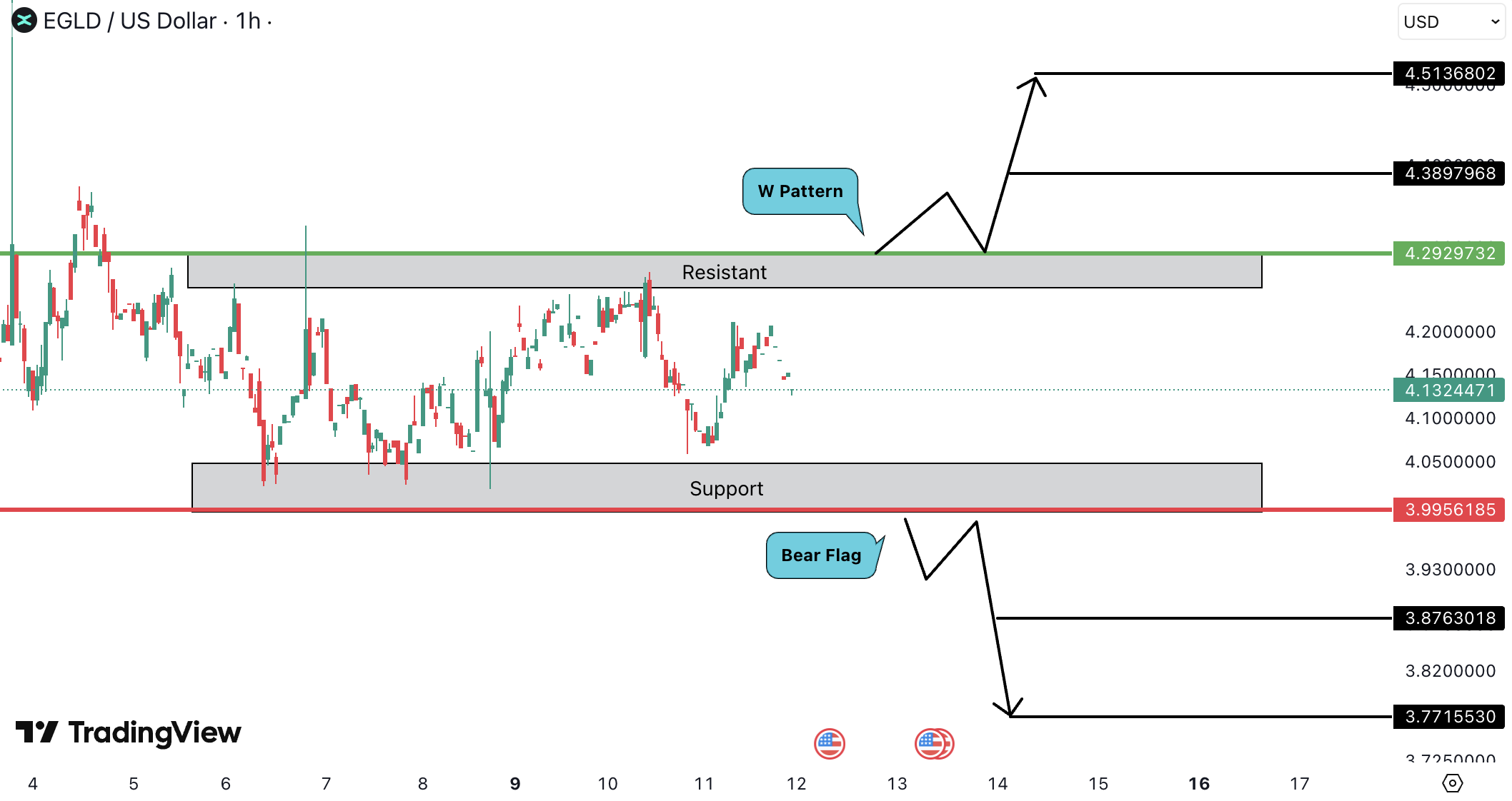 On the 1H timeframe, EGLDUSD is consolidating between 4.29 USD resistance (3.95 EUR) and 3.99 USD support (3.67 EUR).