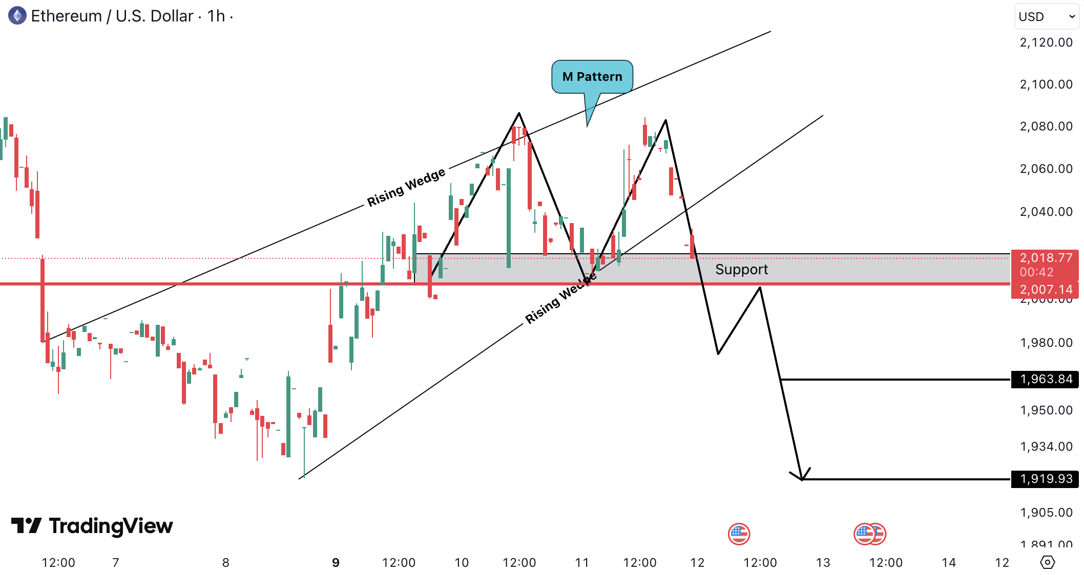 On the 1H timeframe, ETHUSD is forming an M pattern inside a rising wedge and is testing the 2,000.00 USD – 2,007.00 USD support zone (approx. 1,840 EUR – 1,846 EUR).