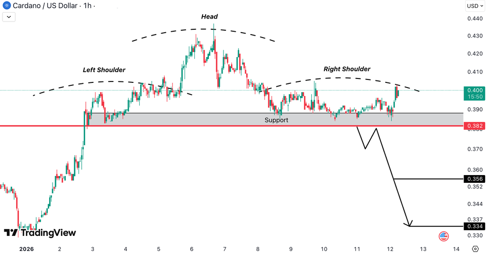 ADAUSD a format un head and shoulders clasic. Pretul se mentine peste zona de suport cheie din jurul 0.382 USD (≈ 0.351 EUR), nivel care actioneaza ca neckline support.