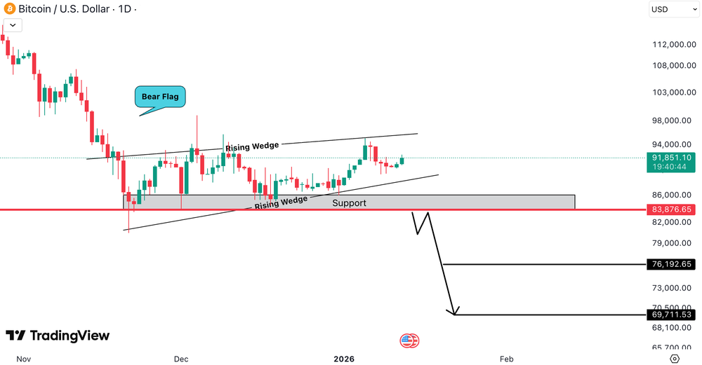 BTCUSD se tranzactioneaza intr-o structura bearish mai ampla. Pretul a format un bear flag, urmat de un rising wedge, combinatie care indica de regula un scenariu de bearish continuation. In acest moment, BTCUSD se mentine peste zona de suport cheie din jurul 83,876.00 USD (≈ 77,170.00 EUR), insa aceasta zona ramane vulnerabila.