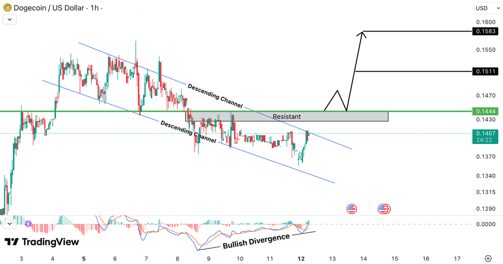 DOGEUSD se tranzactioneaza intr-un descending channel, insa divergenta bullish pe oscillator indica slabirea momentumului bearish si creste probabilitatea unui move ascendent. Pretul se apropie de rezistenta cheie din zona 0.1444 USD (≈ 0.133 EUR).