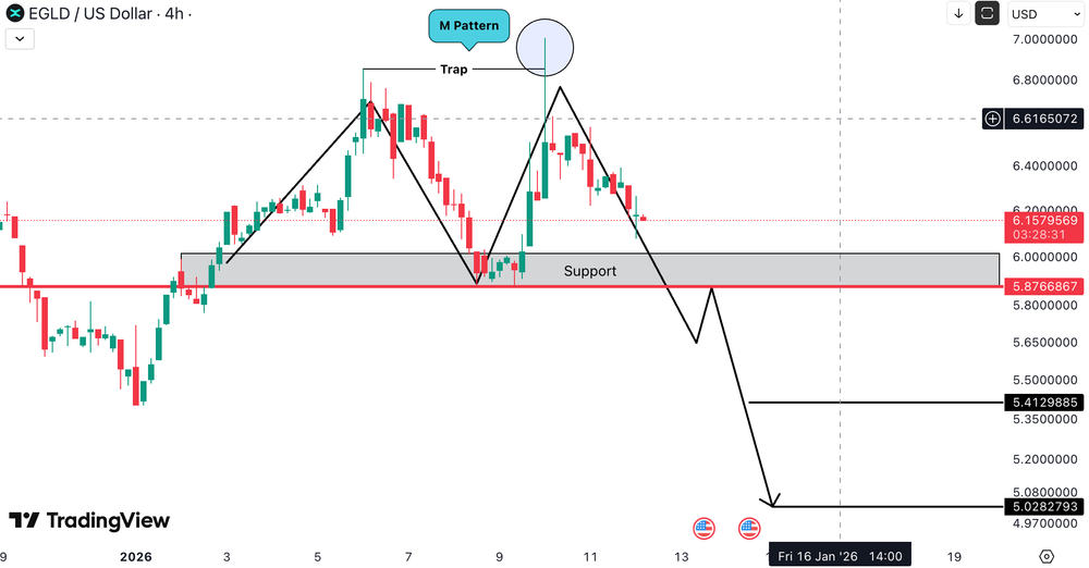 EGLDUSD a format un M pattern clar, semnaland un potential bearish reversal dupa un liquidity trap in zona maximelor. Pretul se apropie in prezent de suportul cheie de la 5.87 USD (≈ 5.40 EUR).