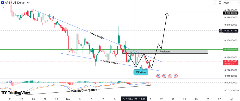 APEUSD afiseaza o combinatie de falling wedge si W pattern, sustinuta suplimentar de bullish divergence, ceea ce creste probabilitatea unui reversal bullish. Confirmarea ramane cheia.