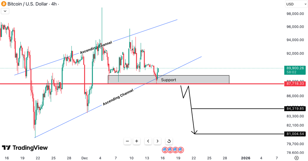 O spargere clara si inchidere de lumanare sub zona de suport de 87,718 USD (aprox. 74,560 EUR) ar valida continuarea bearish, cu tinte in zona 84,319 USD (aprox. 71,670 EUR) si ulterior 81,004 USD (aprox. 68,850 EUR).
