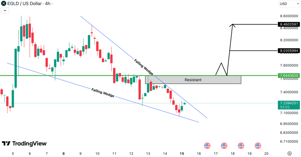 EGLDUSD construieste un falling wedge, pattern clasic cu probabilitate crescuta pentru un move bullish. Scenariul devine valid doar dupa confirmare.
