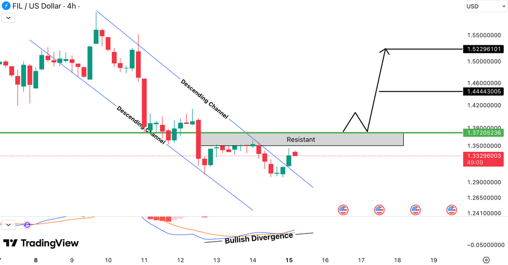 FILUSD se afla intr-un descending channel, dar prezinta bullish divergence, semnal care sugereaza slabirea presiunii de vanzare. Confirmarea este necesara inainte de orice continuare.