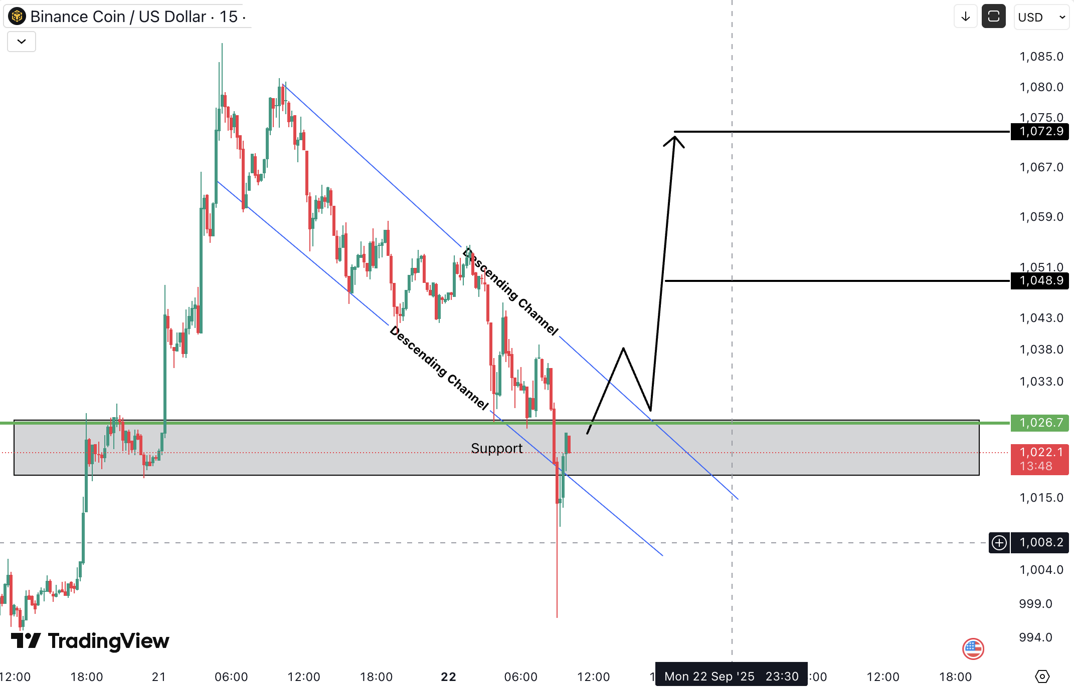 BNBUSD looks bullish as the price is currently respecting both the support zone and the descending channel support.
