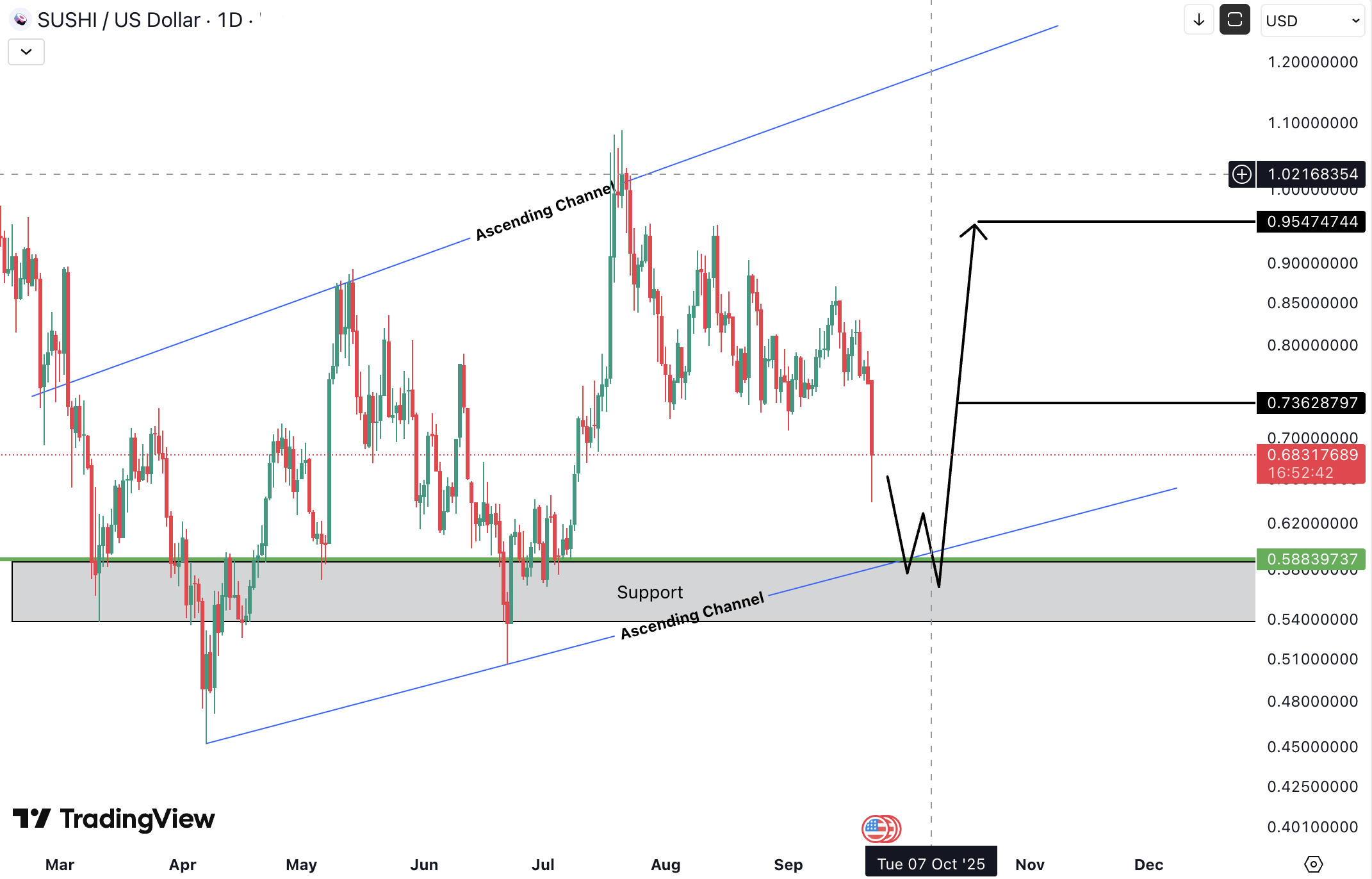 SUSHIUSD is approaching a crucial support zone, aligned with the supportive trendline of the ascending channel.