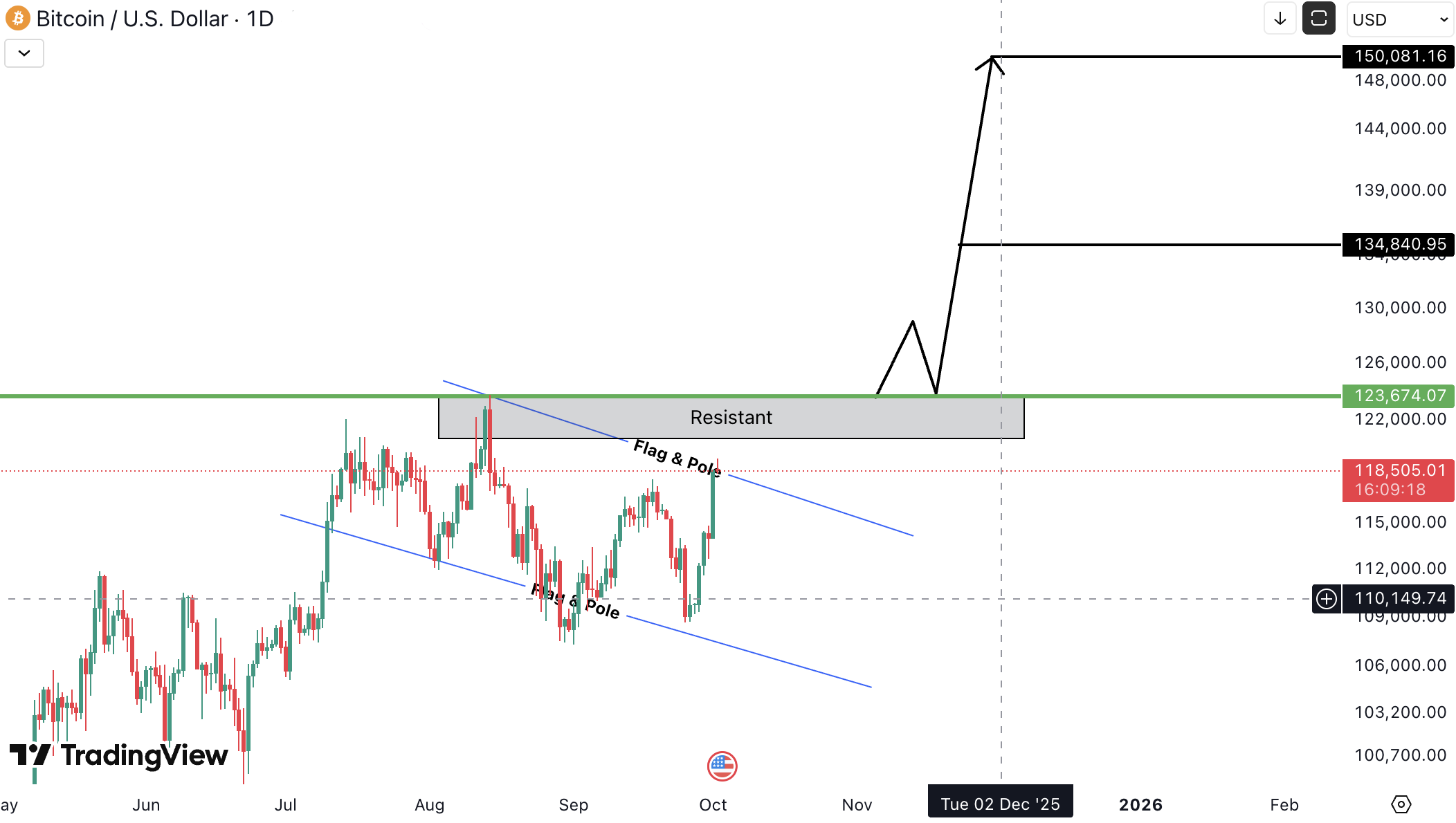 BTCUSD has formed a bull flag on the daily timeframe, increasing the probability of a bullish trend continuation. For confirmation, we need a breakout with a candle closing above the resistance at 123,674.00 USD (~113,998.70 EUR).