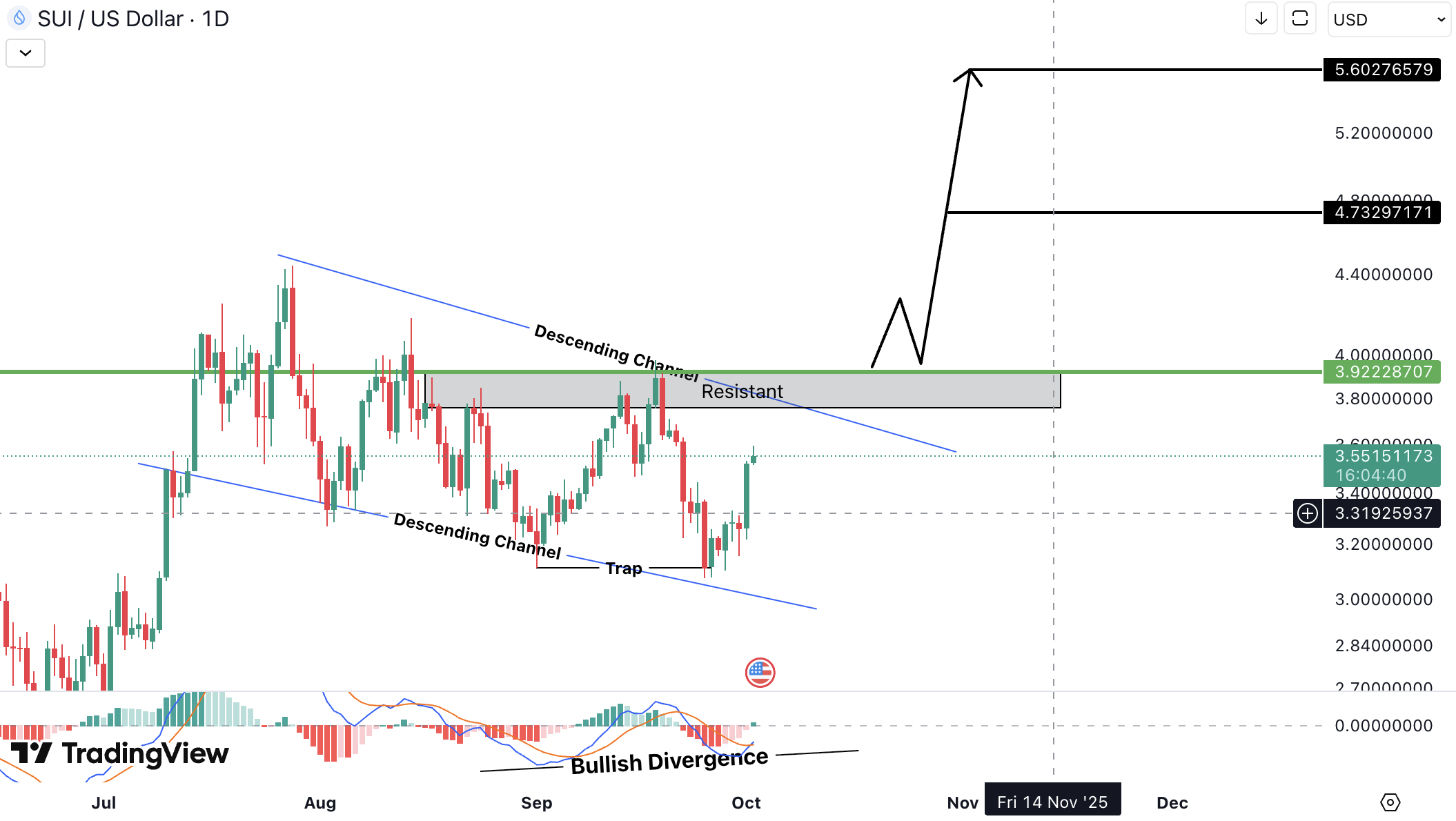 SUIUSD has formed a descending channel accompanied by bullish divergence, raising the probability of a bullish move. For confirmation, we need a breakout and candle closing above 3.92 USD (~3.61 EUR).