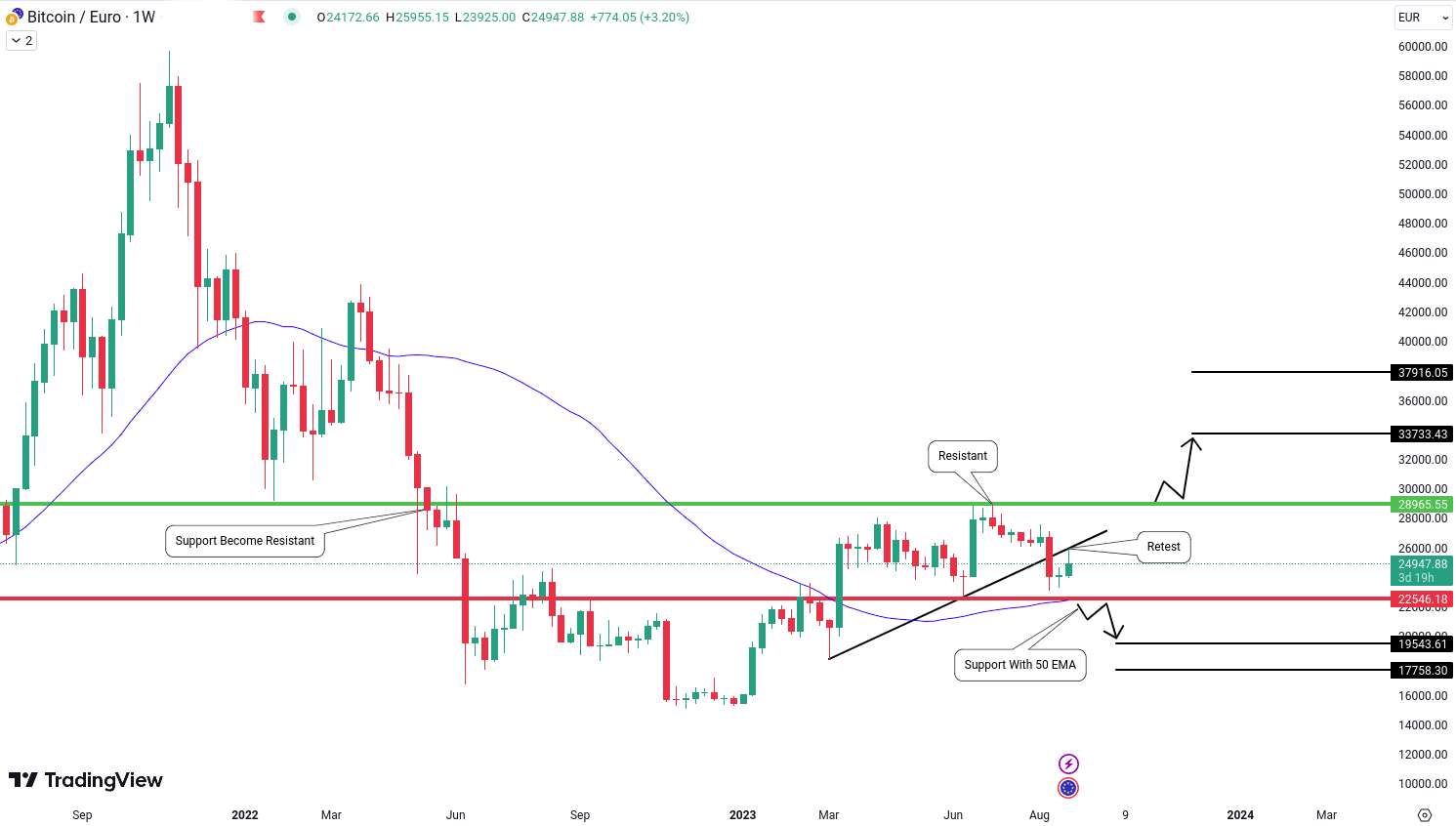 La fel ca in cazul oricarui piata financiara, BTC/EUR prezinta diverse scenarii potentiale. Haideti sa exploram cele doua posibilitati principale: