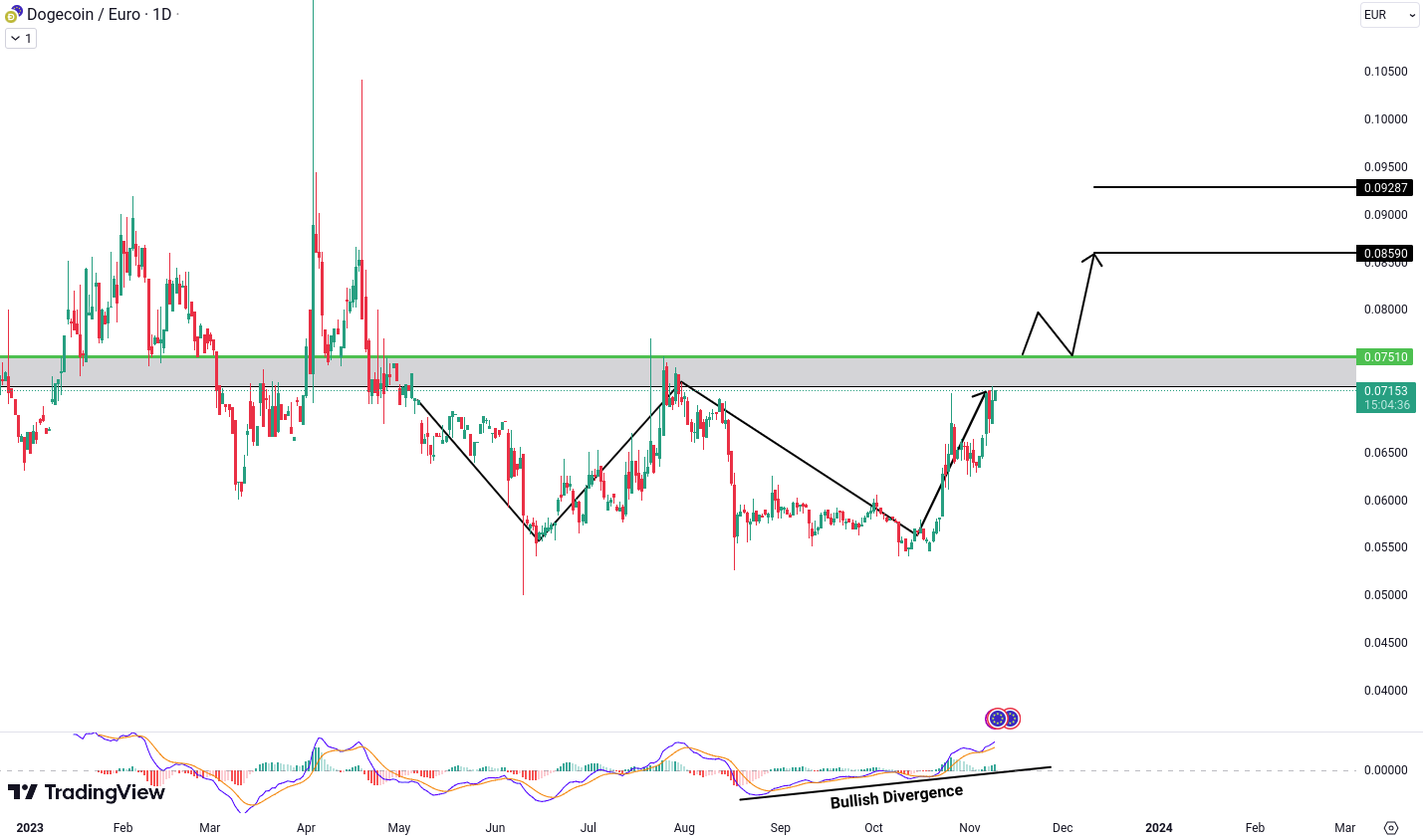 DOGE/EUR formeaza in prezent un model W, impreuna cu o divergenta bullish in intervalul zilnic. Aceasta schimbare de la un trend de minime mai mici la maxime mai mari indica o inversare potentiala. In plus, divergenta bullish indica volume crescute in ciuda faptului ca pretul ramane intr-o anumita zona. Pentru a confirma acest model, am avea nevoie de o iesire deasupra nivelului de 0.07510 Euro, ceea ce ar putea duce la targeturi de 0.08590 Euro si 0.09287 Euro.
