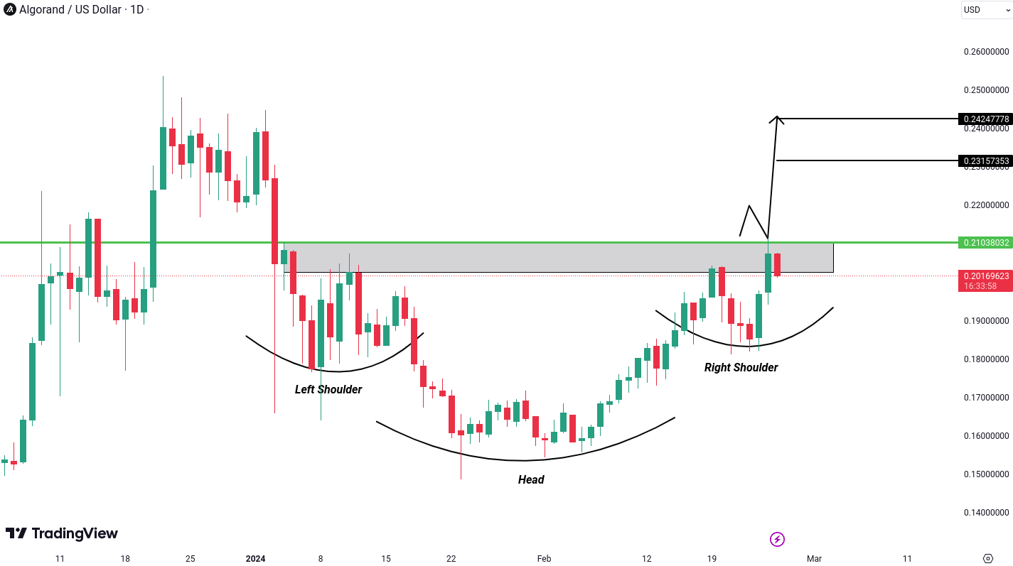 ALGO/USD formeaza un model de “inverse head and shoulders”, indicand o potentiala schimbare de la o structura de piata bearish la una bullish. Acest model este recunoscut pe scara larga in analiza tehnica ca o formare de inversare bullish, sugerand o schimbare in sentimentul pietei.