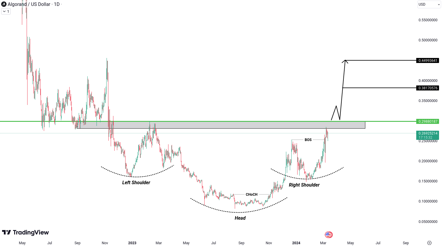 ALGO/USD a format un model de cap si umeri inversat. Acest model sugereaza adesea o posibila schimbare catre o tendinta bullish. Acum, asteptam confirmarea, care ar veni cu o spargere deasupra nivelului de 0.298 USD. Daca vedem aceasta spargere, ar putea deschide usa catre tinte in jurul valorilor de 0.381 USD si 0.449 USD.